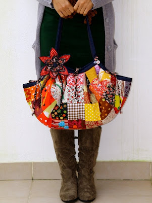 Mala toda em pacthwork com mais de 80 padrões difefentes de tecido, todos 100% algodão. As alças e o rebordo são em ganga e fecha com 3 laços, no centro e nas laterais.