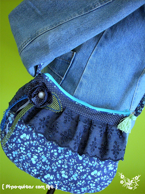 * A base é em jeans; Penduricalho removível (pode ser usado como pregadeira); Bolso interior; Fecha com botão de pressão.